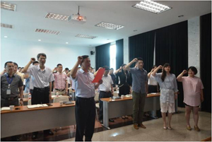 黨課開始前,萬(wàn)軍同志帶領(lǐng)預(yù)備黨員進(jìn)行入黨宣誓。參加黨課的全體黨員也一起重溫入黨誓詞。